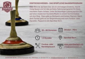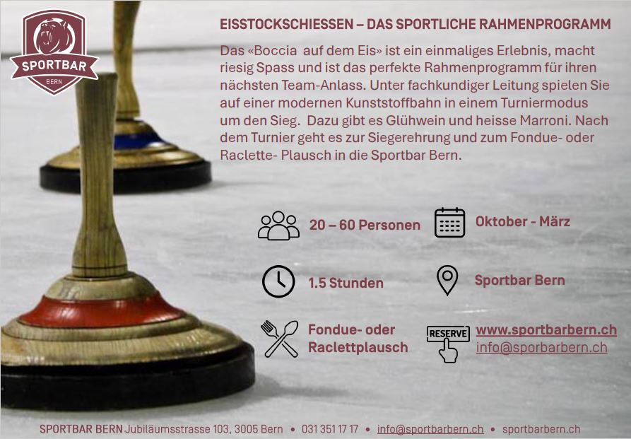 In den Wintermonaten (Oktober - Februar) können Firmen- oder Privatanlass mit Eisstockschiessen, einem Karaoke-Event, einem Krimi-Dinner oder einem Fackelspaziergang durch den Dählhölzliwald kombiniert werden. Buchungen für diese Zusatzangebote nehmen wir jederzeit gerne entgegen.